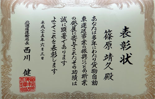 平成25年6月、北海道運輸局長を受賞しました。